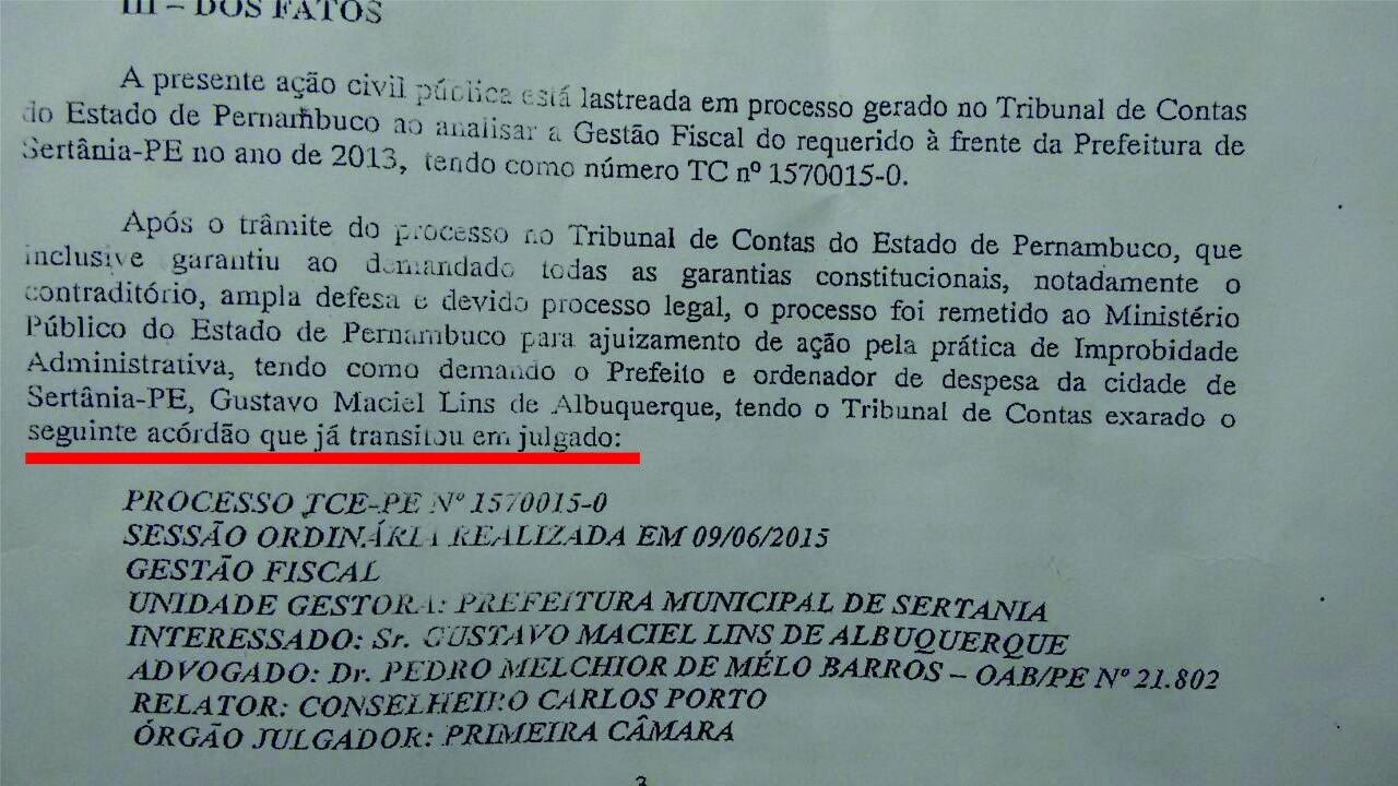 A redação do Moxotó da Gente informa a assessoria do prefeito Guga Lins que o Acórdão relativo ao processo 150015-0 que trata da reprovação da Gestão Fiscal do 3º quadrimestre de 2013 já transitou em julgado, segundo a peça da Ação de Improbidade Administrativa movida pelo Ministério Público de Pernambuco contra o prefeito de Sertânia que teve todas as garantias constitucionais para fazer sua defesa. “O Sr. Gustavo Maciel Lins de Albuquerque, Prefeito, apesar de devidamente notificado (fls. 38-40 e 51-53), deixou transcorrer in albis (sem nenhuma providência) o prazo concedido para apresentação de defesa”, texto extraído da deliberação da 39ª Sessão Ordinária da Primeira Câmara realizada em 09/06/2015.