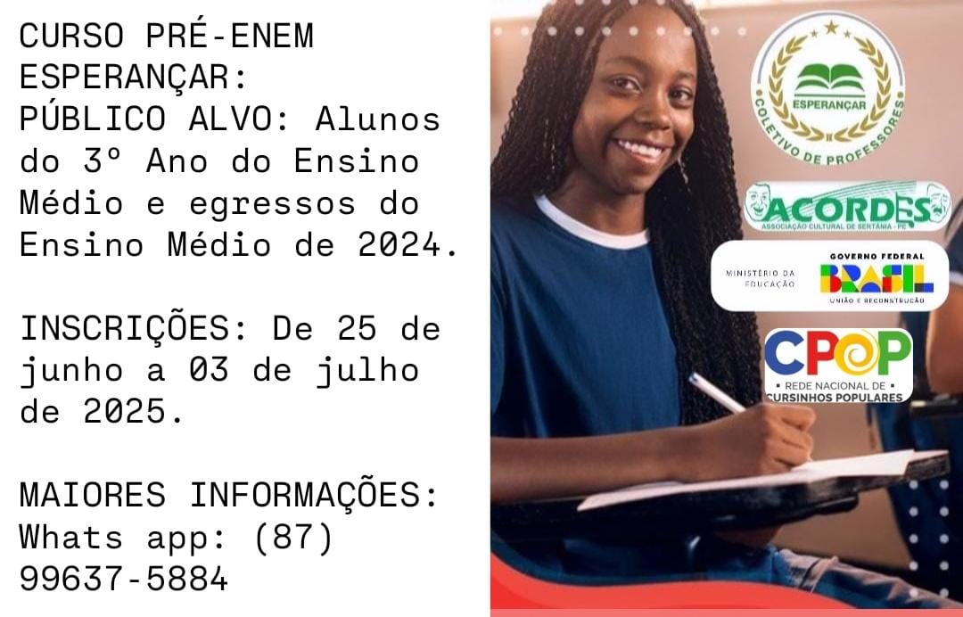 O Coletivo Esperançar em parceria com a Associação Cultural de Sertânia (ACORDES) e apoio do Governo Federal, Ministério da Educação através da Secretaria de Educação Continuada, Alfabetização de Jovens e Adultos, Diversidade e Inclusão (Secadi), iniciou inscrições para o curso Pré-ENEM ESPERANÇAR. O Pré-ENEM ESPERANÇAR faz parte da Rede Nacional de Cursinhos Populares (CPOP) que apoiará cursinhos populares e estudantes no Brasil que buscam ingressar no ensino superior, por meio do Exame Nacional do Ensino Médio (Enem).