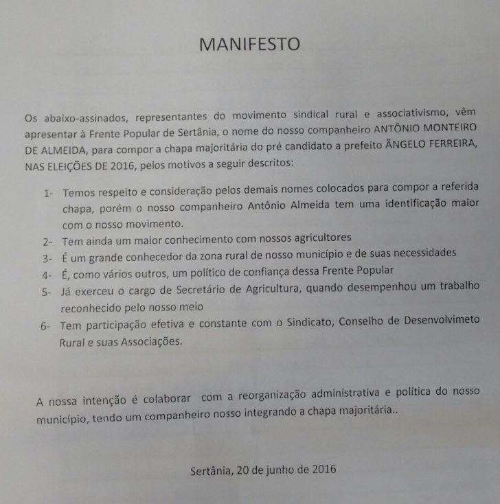 Dezenas de representantes de associações rurais de Sertânia assinaram um manifesto em apoio ao vereador Antônio Almeida para composição da chapa da Frente Popular de Sertânia, que será encabeçada pelo deputado estadual Ângelo Ferreira.