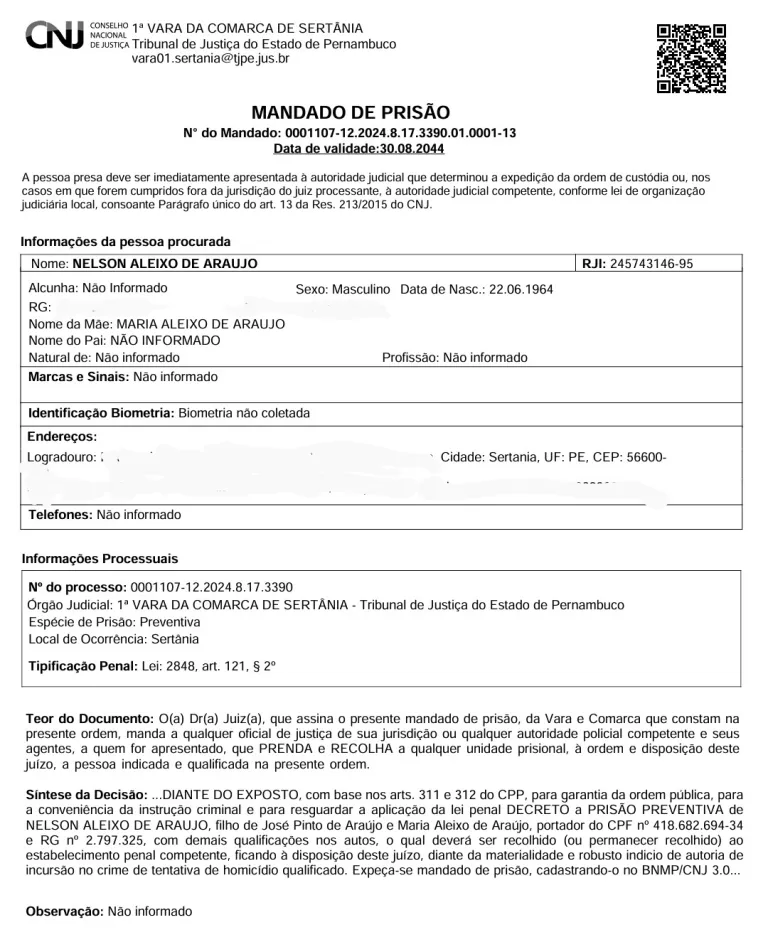O blog de Nill Junior teve acesso à decisão que embasou o mandado de prisão de Nelson Aleixo de Araújo, de 60 anos, o Nelson do Consórcio, autor do atentado contra o prefeito Ângelo Ferreira.