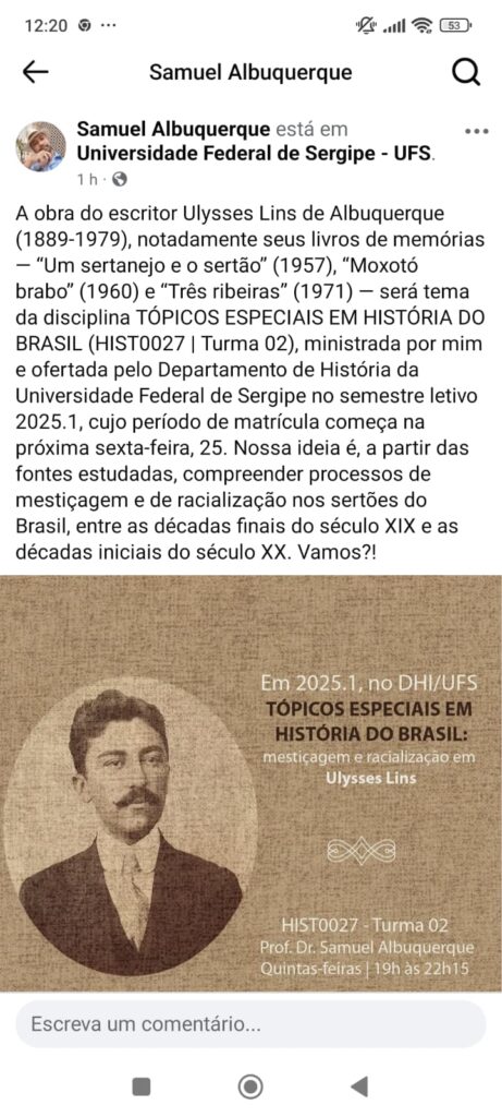 A cultura, a arte e a literatura de Sertânia continuam a ganhar reconhecimento além das fronteiras pernambucanas. Desta vez, as memórias do escritor Ulysses Lins serão objeto de estudo na *Universidade Federal de Sergipe (UFS). Suas obras farão parte da disciplina **”Tópicos Especiais em História do Brasil”, ministrada pelo professor *Samuel Albuquerque, destacando a importância de sua produção literária para a compreensão da história e da identidade regional.