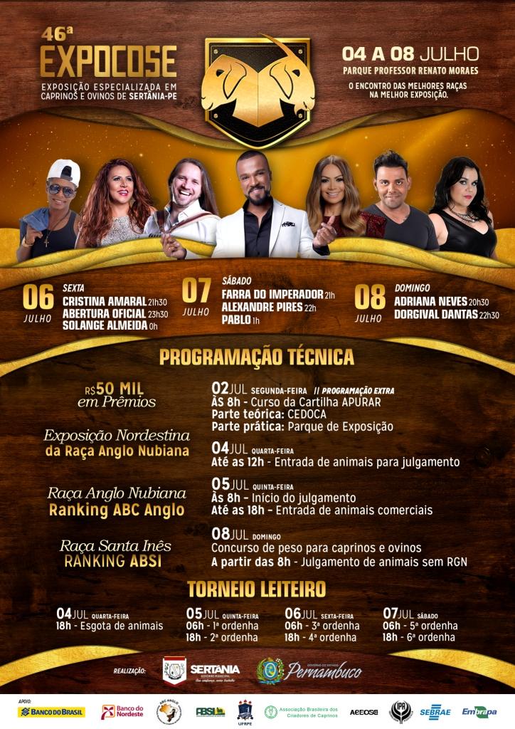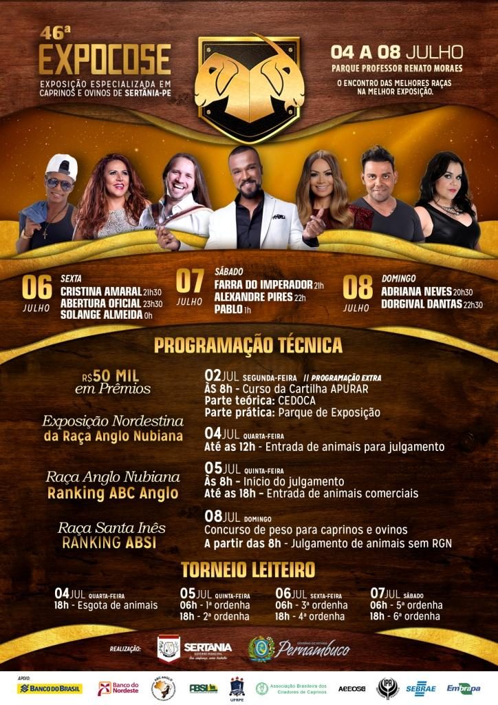 A Exposição Nordestina Especializada em Caprinos e Ovinos de Sertânia, a Expocose, tem início já no próximo dia 04 de julho. A uma semana da maior Exposição da região, os detalhes sobre a programação técnica foram divulgados. Serão duas entradas dos animais na Exposição. Para julgamento, a entrada acontece já no primeiro dia de realização do evento, na quarta-feira (04), até o meio-dia. A entrada de animais comerciais fica aberta até as 18h da quinta-feira (05). Já nesta segunda-feira (dia 02), acontece como programação extra o curso da Cartilha Apurar. A parte teórica acontece no Centro de Excelência em Derivados de Carne e Leite, o CEDOCA, a partir das 8h da manhã. A parte prática acontece já no Parque Professor Renato Moraes.