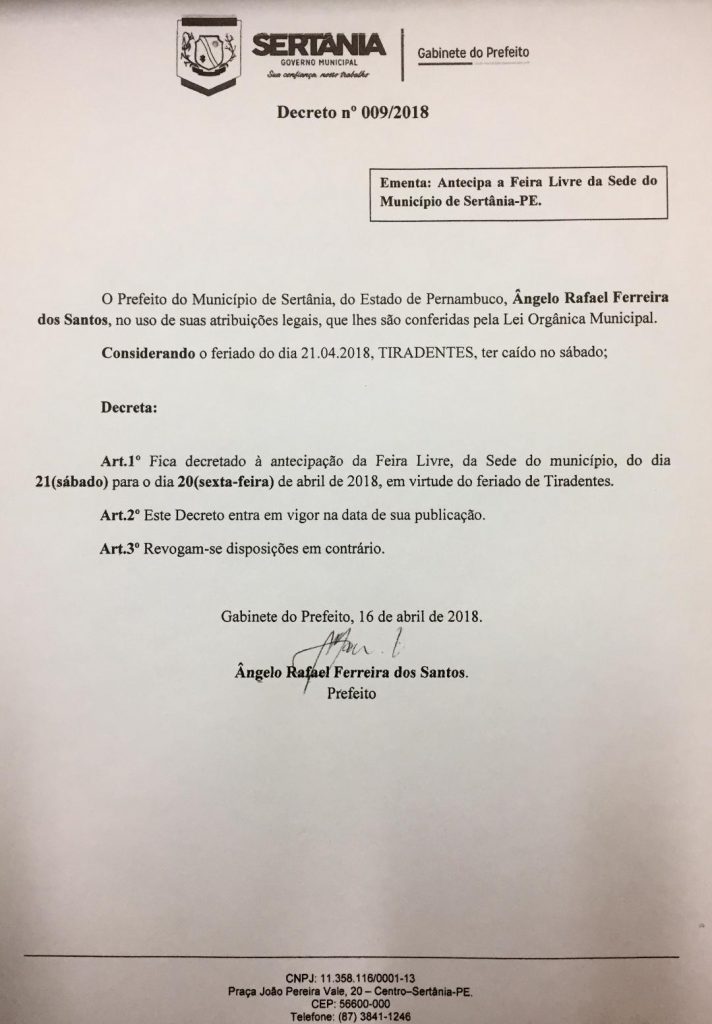 Devido ao feriado de Tiradentes, em 21 de abril, que cai no próximo sábado, a Feira Livre da sede do município de Sertânia será antecipada e vai acontecer na sexta-feira, dia 20.