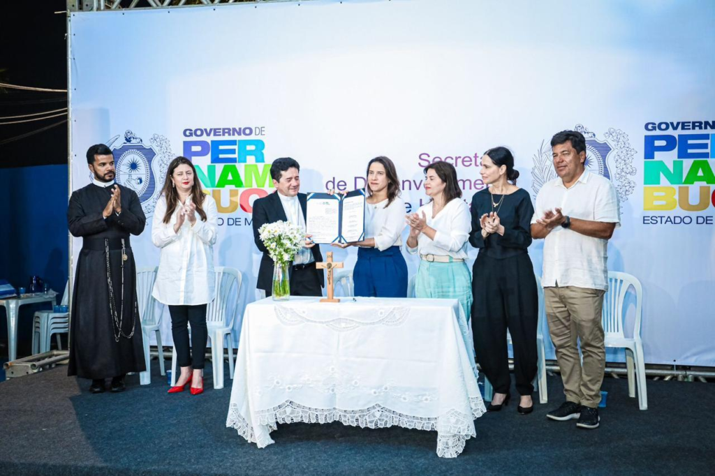 Acompanharam a assinatura a secretária da Mulher em exercício, Juliana Gouveia, a presidente da Fundarpe, Renata Borba, e o padre Emerson Borges, reitor do santuário.