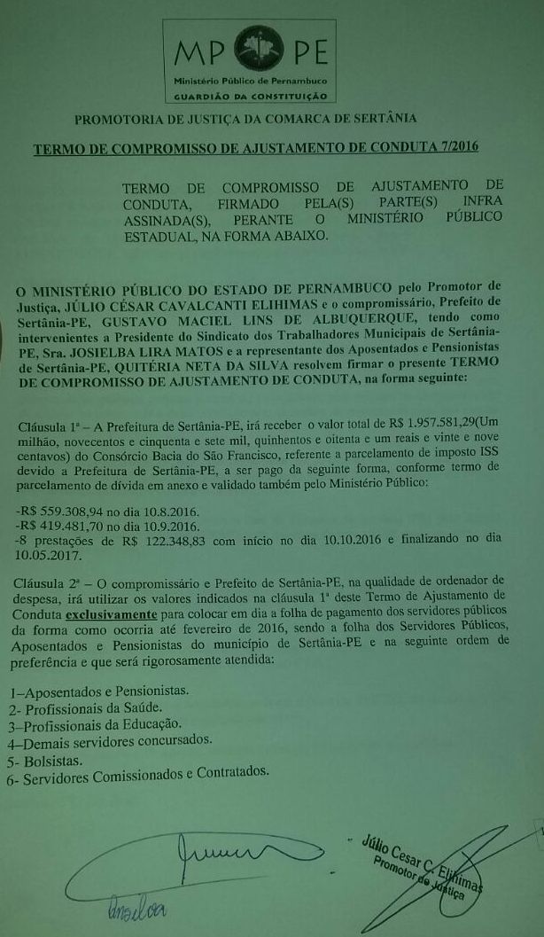 O Ministério Público de Pernambuco, através do Promotor de Justiça na Comarca de Sertânia divulgou o Termo de Compromisso de Ajustamento de Conduta assinado pelo prefeito de Sertânia, Guga Lins; no qual ele se compromete a pagar os salários atrasados dos servidores públicos municipais, bem como aposentados e pensionistas. O documento também foi assinado pela do Sindicato dos Servidores Municipais de Sertânia – SINTEMUSE, Josielba Lira e pela representante dos aposentados e pensionistas, Quitéria Neta.