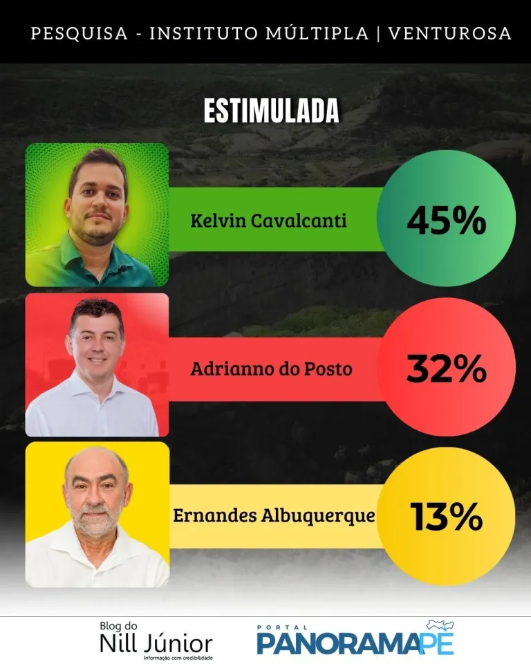 O pré-candidato governista à prefeitura de Venturosa, Kelvin Cavalcanti, lidera as intenções de voto para a prefeitura de Venturosa. Ele tem 45% das intenções de voto, contra 32% dos candidatos oposicionistas Adriano do Posto e 13% de Ernandes da Farmácia. Neste cenário estimulado, 2% disseram que vão votar branco ou