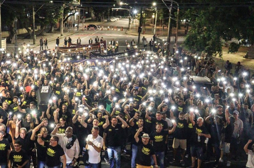 Enquanto cerca de 300 policiais civis esperavam do lado de fora do Palácio do Campo das Princesas, a reunião acontecia com cinco representantes: o presidente do Sinpol, Áureo Cisneiros; o presidente da Associação dos Delegados e Delegadas de Polícia de Pernambuco (Adeppe), Diogo Melo Victor; a presidente da Associação de Polícia Científica do Estado de Pernambuco (Apoc-PE), Camila Reis; além de representantes da União dos Escrivães de Polícia de Pernambuco (Uneppe) e da Associação dos Peritos Papiloscopistas Policiais Civis do Estado de Pernambuco (Asppape).