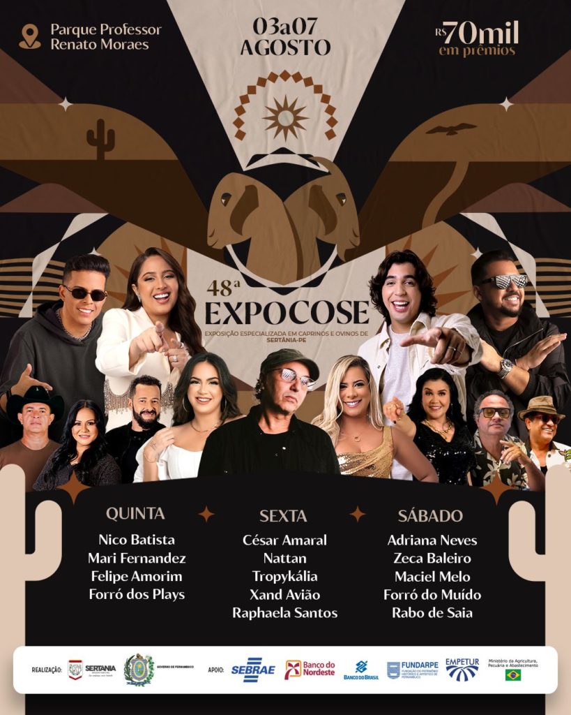 A Prefeitura de Sertânia divulgou novas atrações que vão se apresentar na Exposição Especializada em Caprinos e Ovinos 2022. Passarão pelo palco principal nomes de destaque da música local e regional, como César Amaral, Adriana Neves, Nico Batista e Maciel Melo.