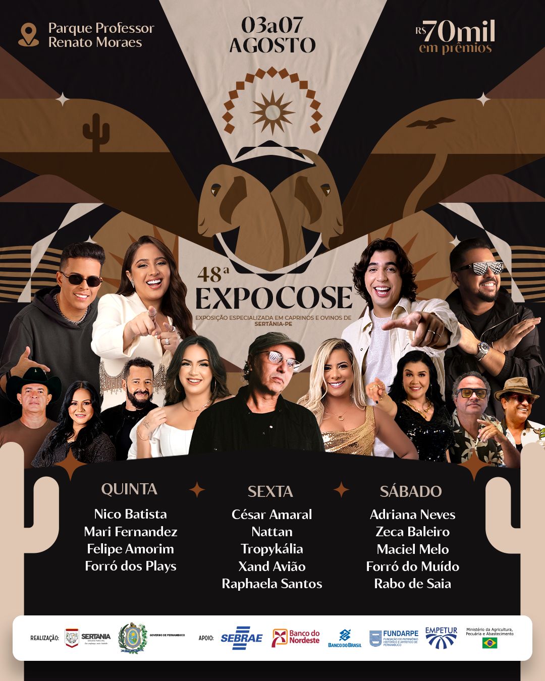 Além desses, a Prefeitura já tinha confirmado os shows de Mari Fernandez, Felipe Amorim, Nattan e Xand Avião. A gestão municipal já trata a Expocose 2022 como uma das maiores de todos os tempos. O evento é gratuito e acontece de 3 a 7 de agosto no Parque de Exposição Professor Renato Moraes.