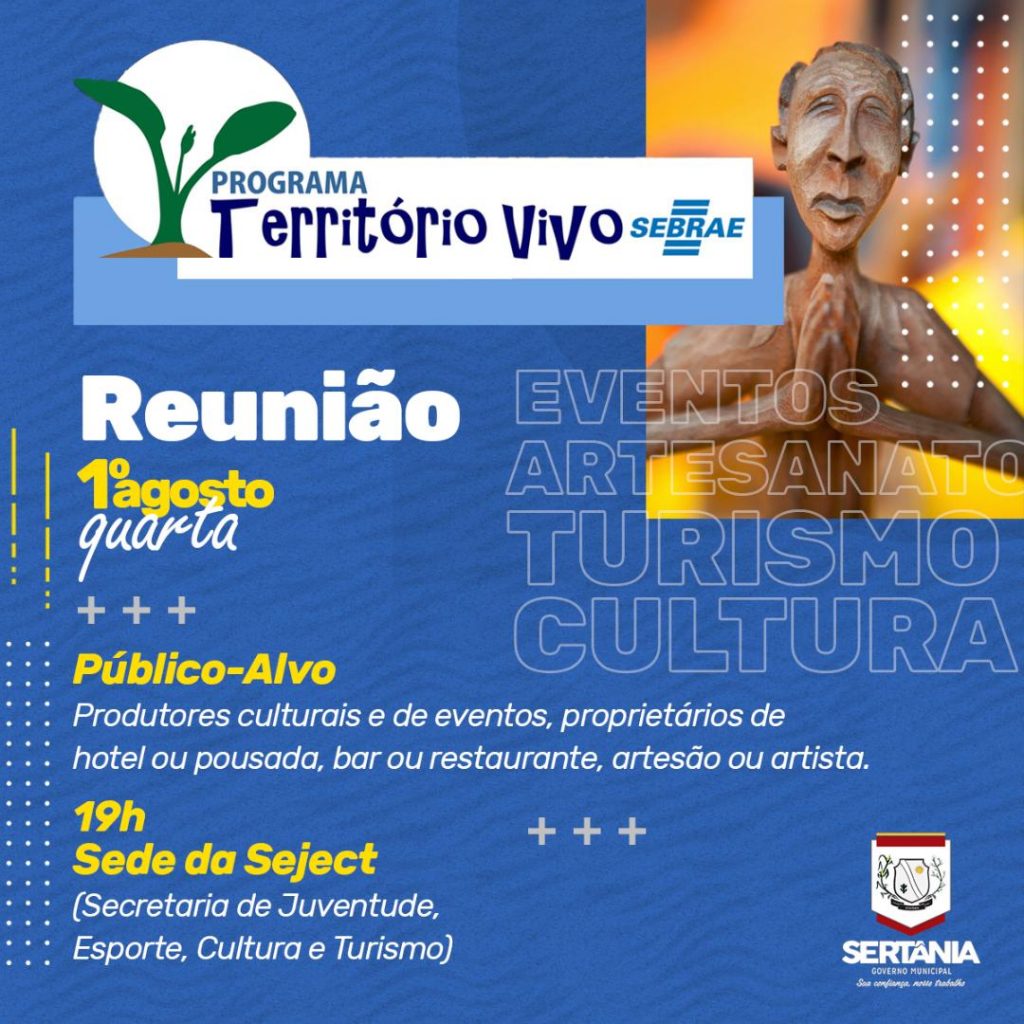 O Programa “Território Vivo” tem como público-alvo lideranças empresariais, instituições privadas ou públicas, representantes de movimentos, associações e pessoas que batalham, produzem e constroem a identidade e o cotidiano das cidades. O objetivo é construir de forma coletiva uma agenda de trabalho e planejamento para o desenvolvimento da nossa região. Pensando nisso, em parceria com o Governo Municipal de Sertânia, por meio da Secretaria de Juventude, Esporte, Cultura e Turismo e da Secretaria de Desenvolvimento Econômico, o programa realiza uma reunião comprodutores culturais e de eventos, proprietários de hotel ou pousada, bar ou restaurante, artesão ou artista, nesta quarta-feira, dia 1° de agosto, às 19h. O encontro acontece na sede da Seject, na Antiga Estação Ferroviária. Quem se interessa por turismo, eventos, cultura e artesanato está convidado a participar.