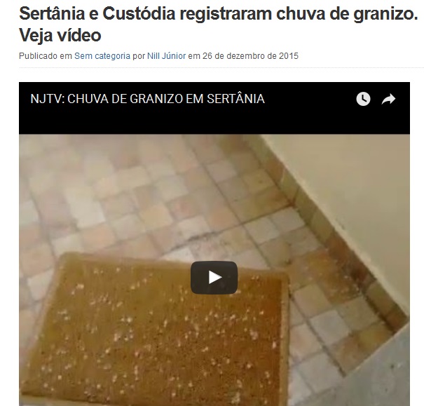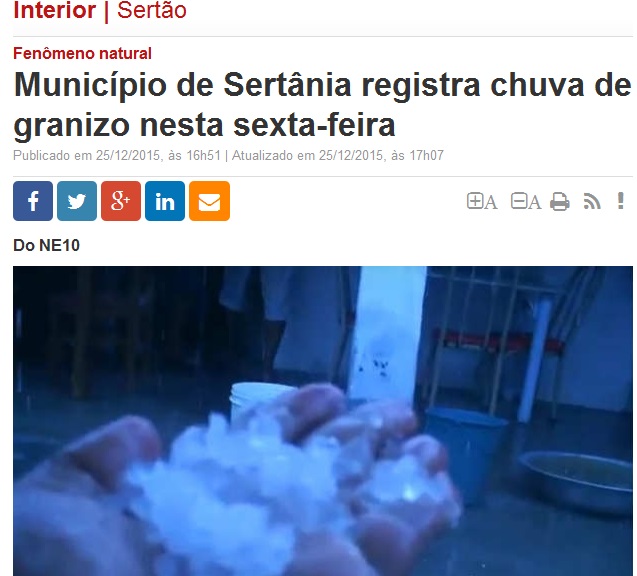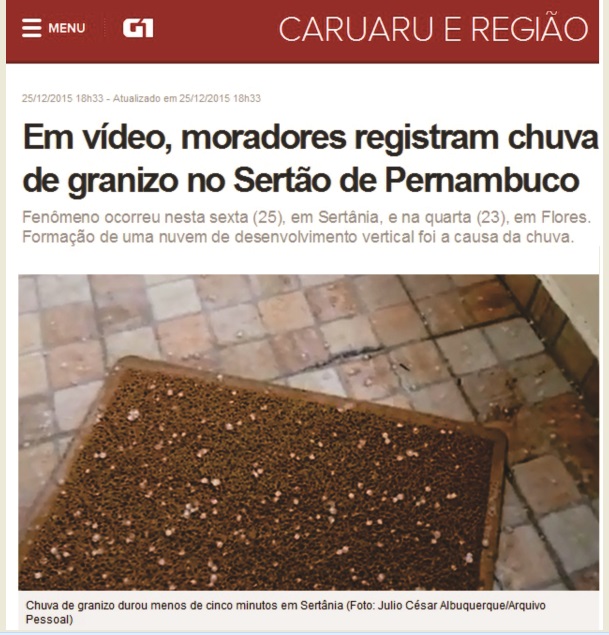 Além de ser notícia nos blogs blogs da região, a chuva de granizo registrada ontem (25) em Sertânia, no Moxotó de Pernambuco, repercutiu nos principais meios de comunicação do estado através de suas paginas da internet.