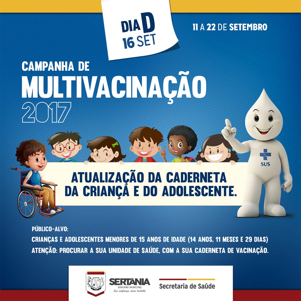 Começou nesta semana uma campanha de Multivacinação em todo o País. Em Sertânia, no Sertão do Moxotó, a Secretaria Municipal de Saúde está se engajando para atualizar a caderneta de vacinação de crianças e adolescentes de até 15 anos, no município. No próximo sábado (16), será o Dia D. Todos os postos de Saúde e o Centro de Saúde da Mulher e da Criança estarão abertos e prontos para receber a população sertaniense, das 7h às 17h. A mobilização segue até o dia 22 deste mês de setembro. São 13 tipos de vacinas disponíveis. Para garantir a imunização, basta comparecer à Unidade de Saúde mais próxima portando a caderneta de vacinação. Quem não tiver o documento, pode providenciá-lo no próprio local.