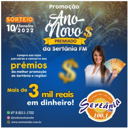 A Sertânia FM lançará nesta sexta-feira (08/10), mais uma promoção para movimentar o comércio local. É o “Ano Novo Premiado da Sertânia FM”, que neste ano premiará os clientes das lojas parceiras com mais de R$ 3 mil em dinheiro vivo.