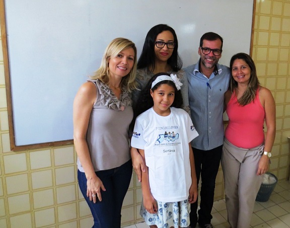 A mesa julgadora formada pelos professores Gilberto, Luciana e Amanda a aluna Analice Ester, que estuda na Escola Municipal Presidente Vargas, para representar Sertânia na etapa regional em Arcoverde no dia 1º de agosto.