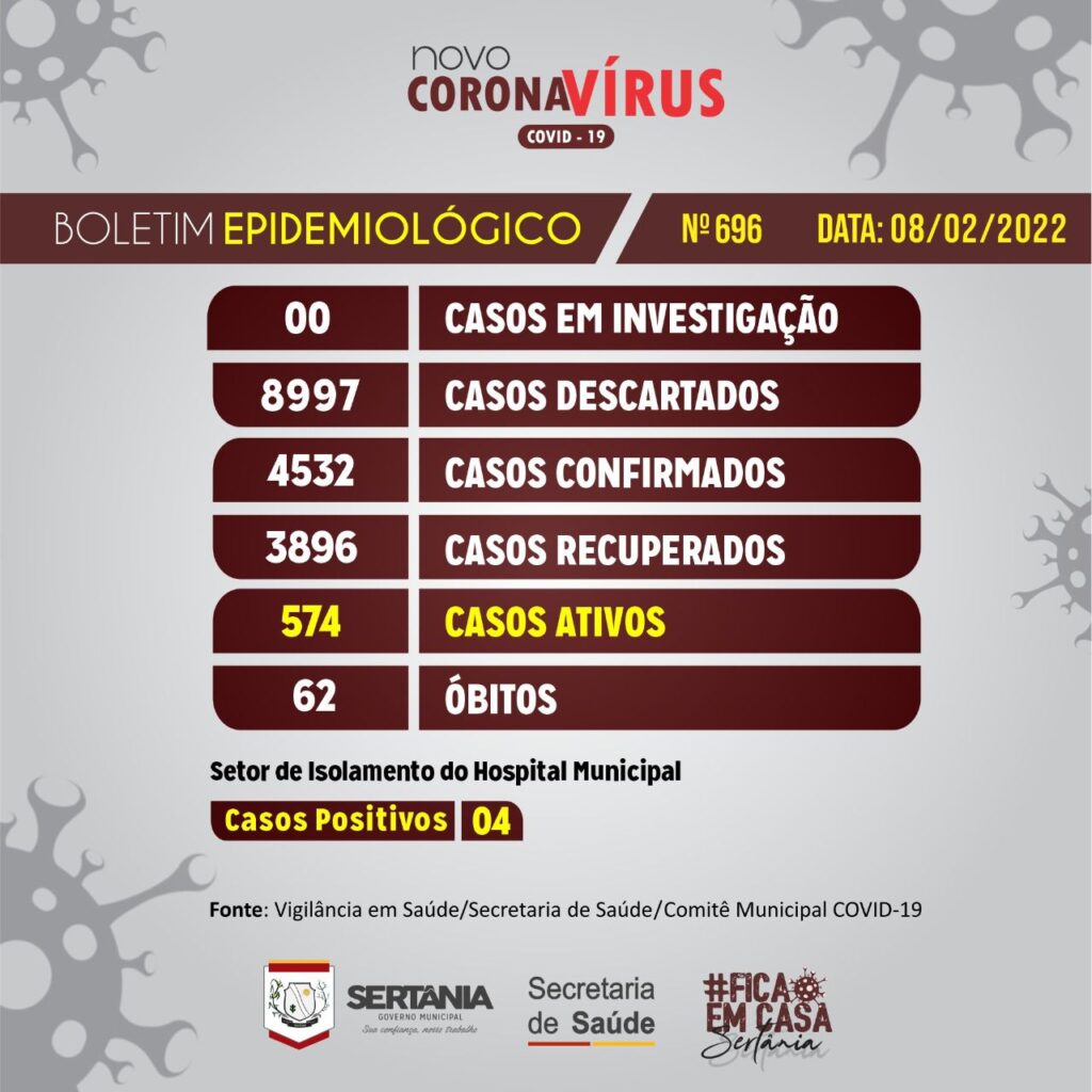Nesta terça-feira (08), o boletim informou que 39 casos de COVID-19 foram registrados em Sertânia. O boletim traz a informação da recuperação de 54 pacientes e o registro de mais um óbito, totalizando 62 mortes desde o março de 2020.