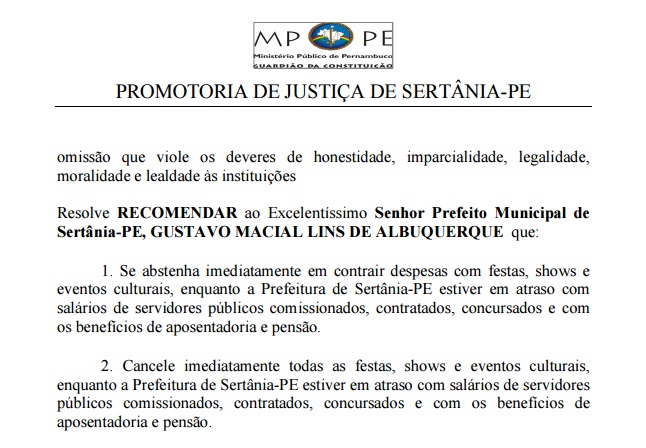 A prefeitura de Sertânia utilizou a nota para tentar enganar a população distorcendo o teor do documento do MP, ao afirmar que o promotor “recomendou ao prefeito desta municipalidade que não fosse realizada nenhuma festividade antes da realização do pagamento dos servidores aposentados”. Na realidade, o prefeito recebeu a recomendação de não realizar festas, shows e eventos culturais, enquanto estiver em ATRASO com salários de servidores públicos comissionados, contratados, concursados e com os benefícios de aposentadoria e pensão. Isso significa que não basta pagar os salários, dever do município que não vem sendo cumprido, mas pagar tudo o que esta em atraso.